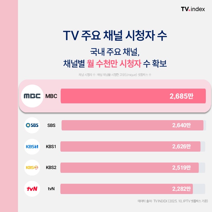 2025년 10월 기준, MBC(2,685만), SBS(2,640만), KBS1(2,626만), KBS2(2,519만), tvN(2,282만) 등 주요 방송 채널은