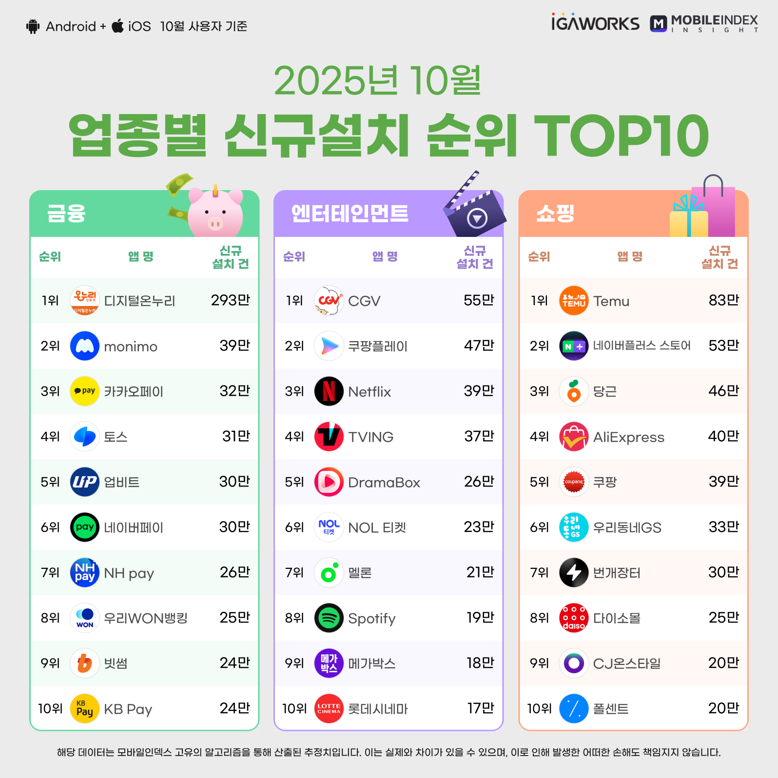 [아이지에이웍스] 25년 10월 월간 인기 모바일 앱 순위 총정리