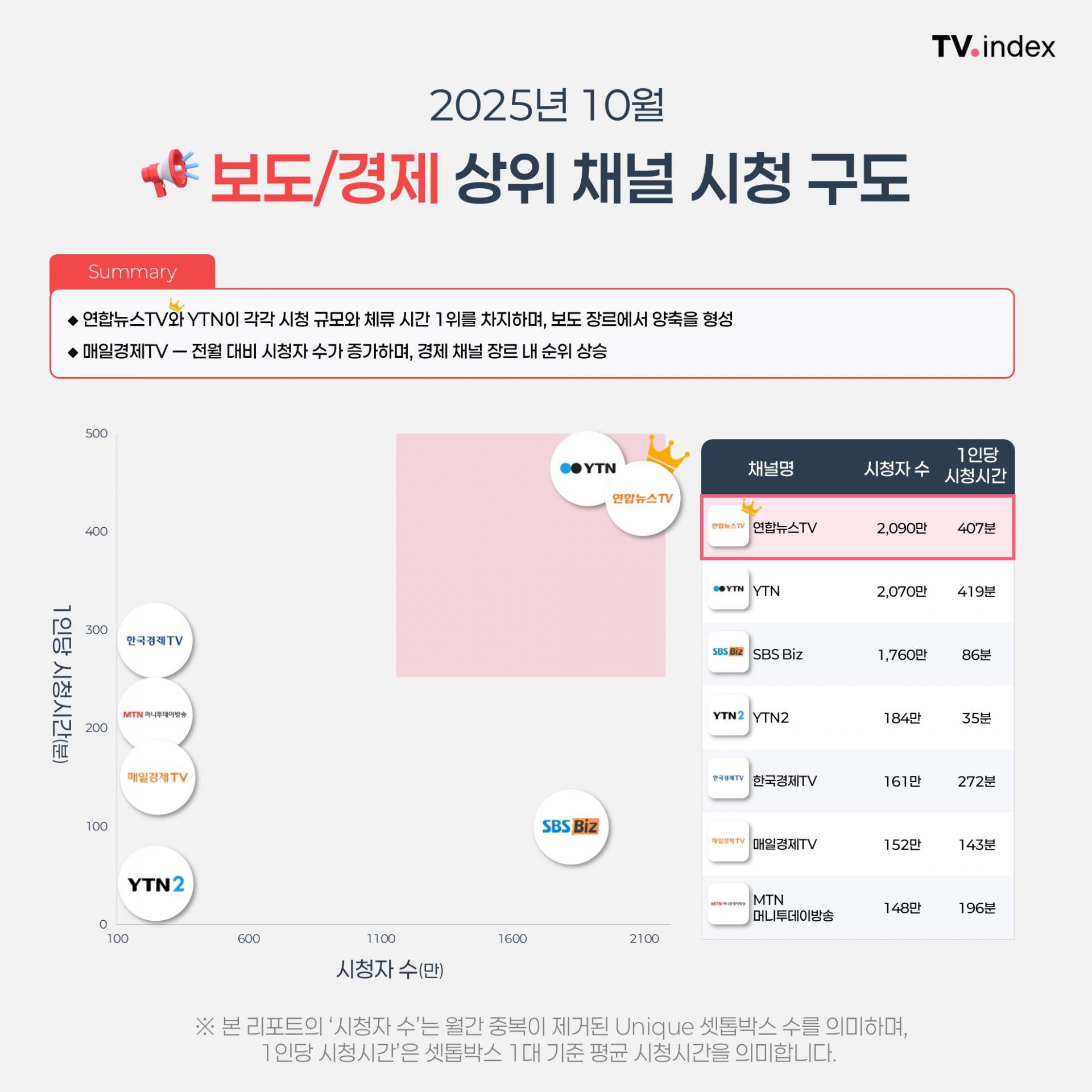 연합뉴스TV는 시청자 수 1위로 ‘도달 규모’에서, YTN은 1인당 시청시간 1위로 ‘시청 몰입도’에서 보도 장르의 양축을 유지했습니다.