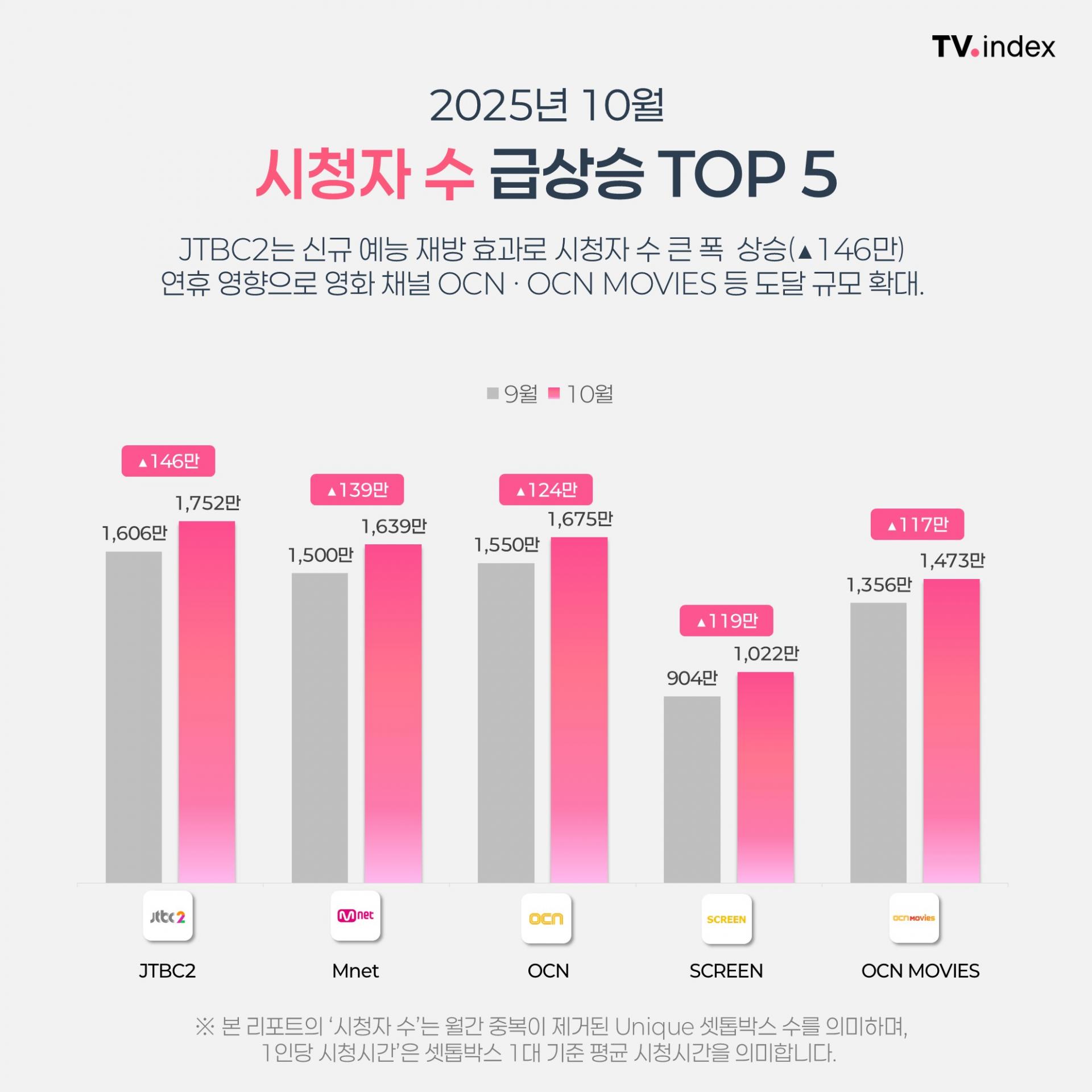 10월 시청자 수 급상승 1위는 JTBC2로, 전월 대비 146만 명 증가했습니다.