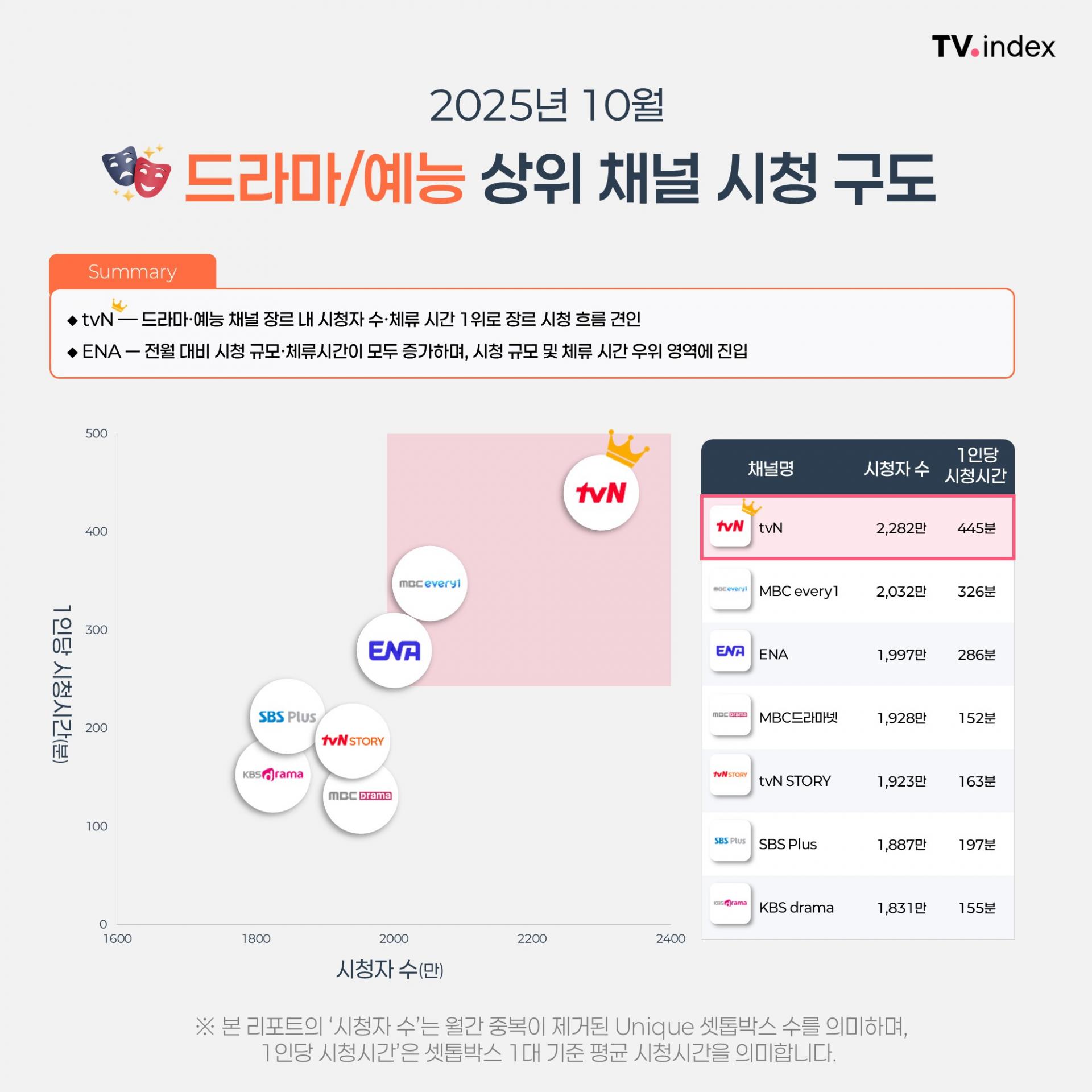 또한 ENA는 추석 특선 편성+신작 드라마 흥행이 맞물리며, 시청자수와 1인당 시청시간이 모두 증가해 두 지표 모두에서 우세 포지션을 확보했습니다.