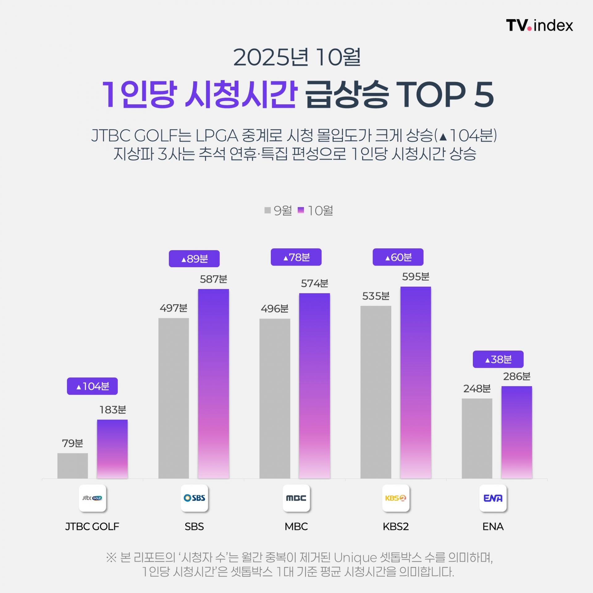 특히 MBC는 시청자 수 1위, KBS2는 1인당 시청시간 기준 1위를 기록하며 각기 다른 강점을 보였습니다.